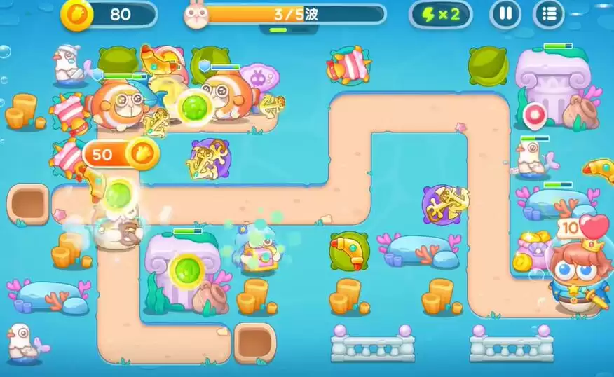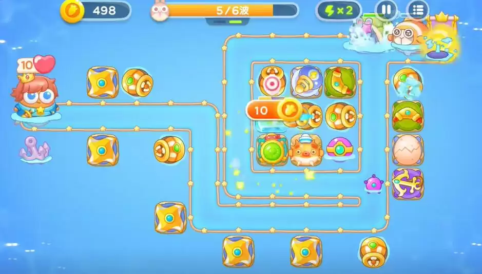 3、在左上角建造鱼雷塔对水下的兔子进行攻击,建造水雷塔,对经过的敌人造成伤害,随后在左下方建造飞镖塔清理左侧的大型障碍物。