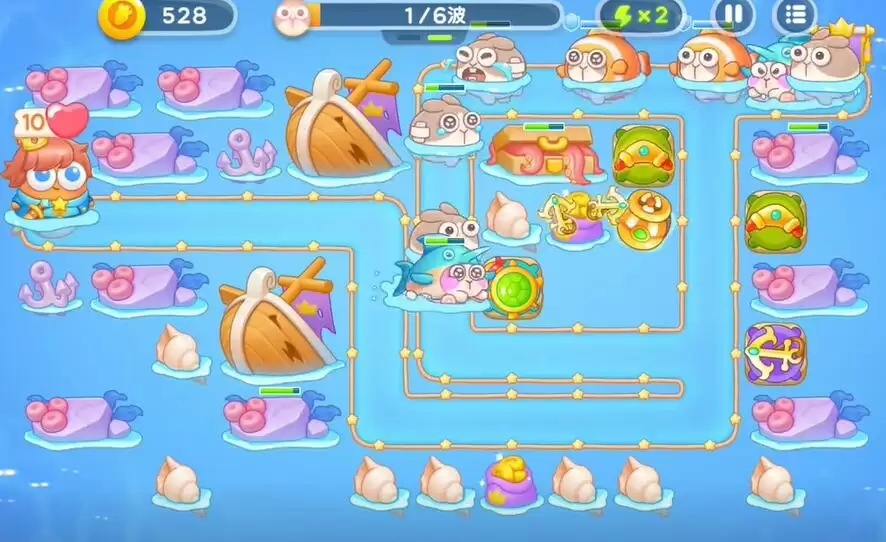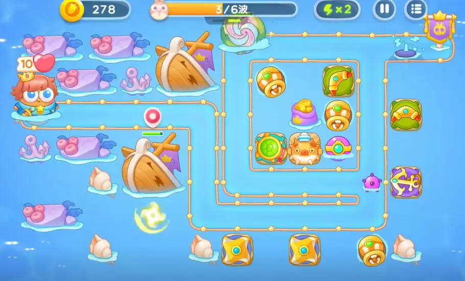 1、利用从第一轮提供的回旋镖和船锚清理掉障碍物,建造鱼雷对水下的怪物进行打击,搭配第一轮的塔守住第一波。