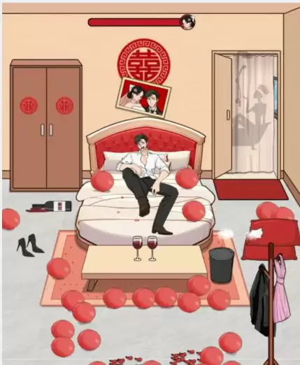1、点击浴室门,拖动衣服、高跟鞋穿好,拖动坏女人到床尾