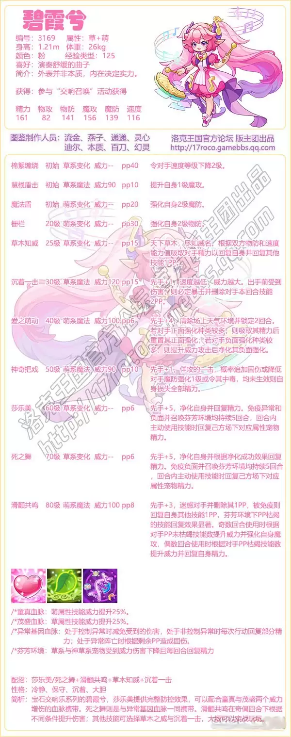 今日给大家带来了《洛克王国》碧霞兮技能表图鉴分享,这是编号为3169的魔攻宠物,宝石交响乐系列的碧霞兮,莎乐美提供完整防控效果,可以配合童真与茂盛两个威力增伤的血脉携带。死之舞则是与异常基因血脉一同携带。下面分享技能表种族值可以让大家快速了解这个宠物各项信息,感兴趣的速来围观吧!