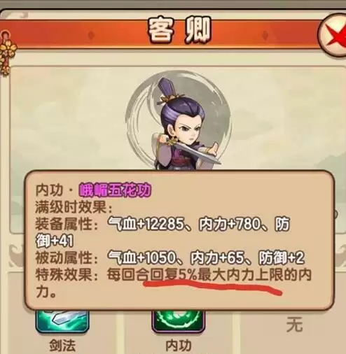 2、前期可以通过主力养刀妹(紫色弟子,自带内省),或者招募客卿灭绝师太(征服峨眉后再交涉一次)学会峨眉五花功(自动回内)来进行合理过度,以此达到解决推图问题。