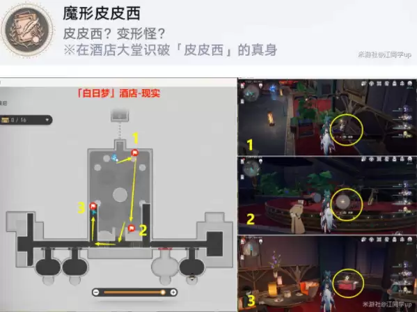 1)将下图3个位置依次【调查】一遍,找到3次变身隐藏起来的皮皮西后,就能获得【英雄】贴纸了,同时获得成就《魔形皮皮西》,属于【与你同行的回忆】