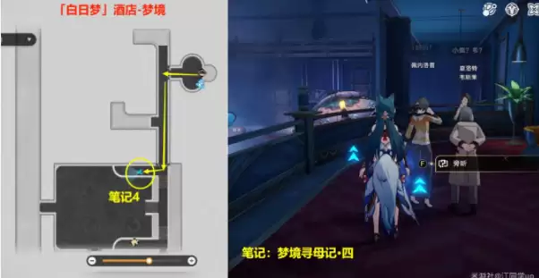 4)接着来到【「白日梦」酒店-梦境】下图位置【旁听】后,获得【笔记:梦境寻母记·四】