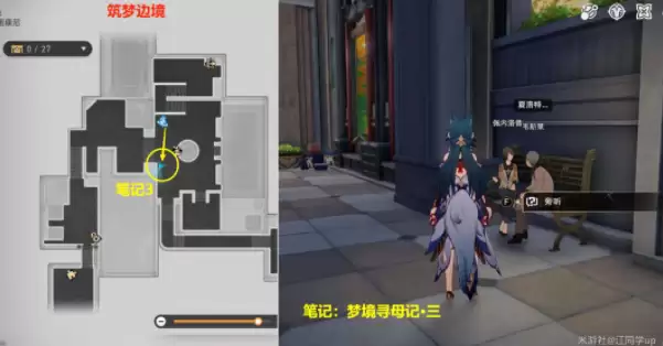 3)接着来到【筑梦边境】下图位置【旁听】后,获得【笔记:梦境寻母记·三】