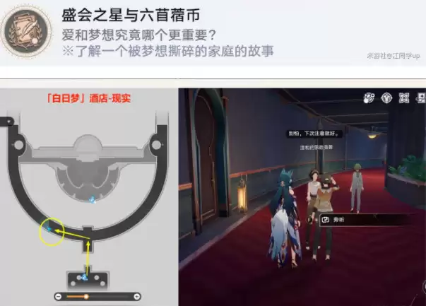 5)最后再来到【「白日梦」酒店-现实】下图位置【旁听】后,就能获得【女儿】贴纸了,同时获得成就《盛会之星与六苜蓿币》,属于【与你同行的回忆】