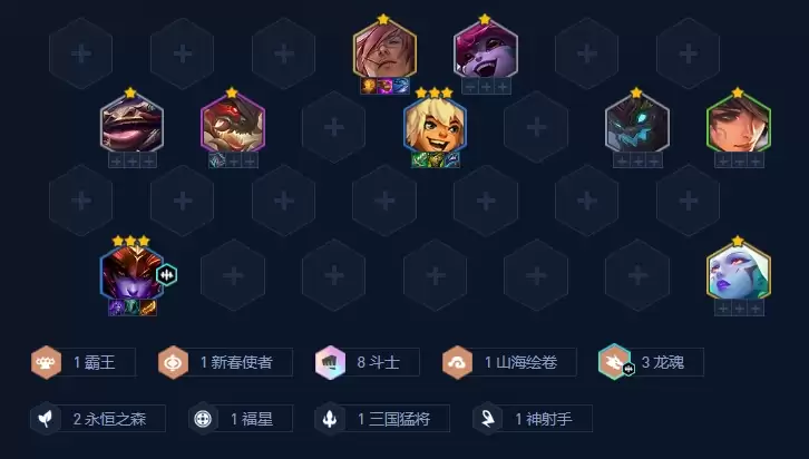 8人口,找三星龙女然后就是上9了,运气好白嫖到了腕豪或者新春使者早开8斗士会更加稳,龙魂天选就可以丢个小炮去前排送了触发龙魂羁绊。