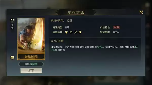 2、[张郃]装备推荐:锐不可当(关键)、破阵驰围。