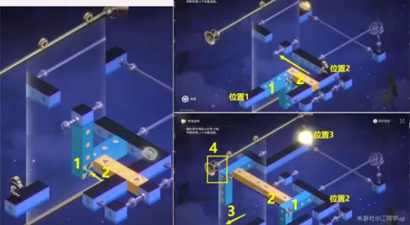 (2)将2黄色模块移到左上,将1蓝色模块点击旋转1次,最后将3镜子往左下移动到滑竿顶端4位置,【钟表小子】会从位置2到位置3,解密完成。