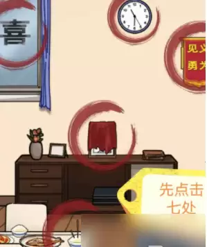 3、接着来到场景三房间中,这里奇怪的地方分别是黑色喜字、锦旗、红色相框、地上散落的面粉、双击打开抽屉点击里面的报纸、地上的火盆、墙上的时钟、倒插在碗中的筷子。