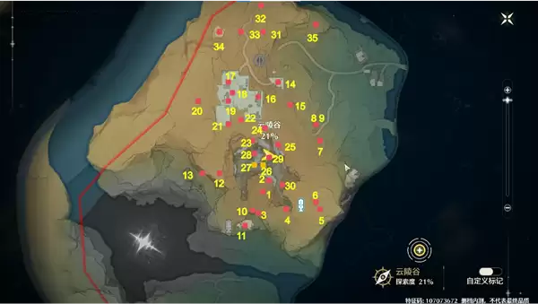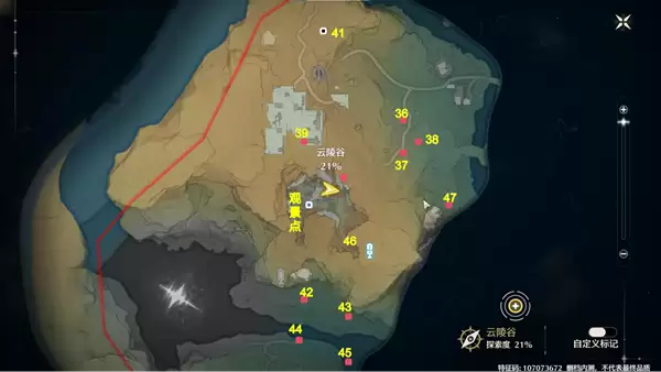 2、云陵谷宝箱(36-47),飞猎手(标点41 42) 观景点,如下图中的标点位置。