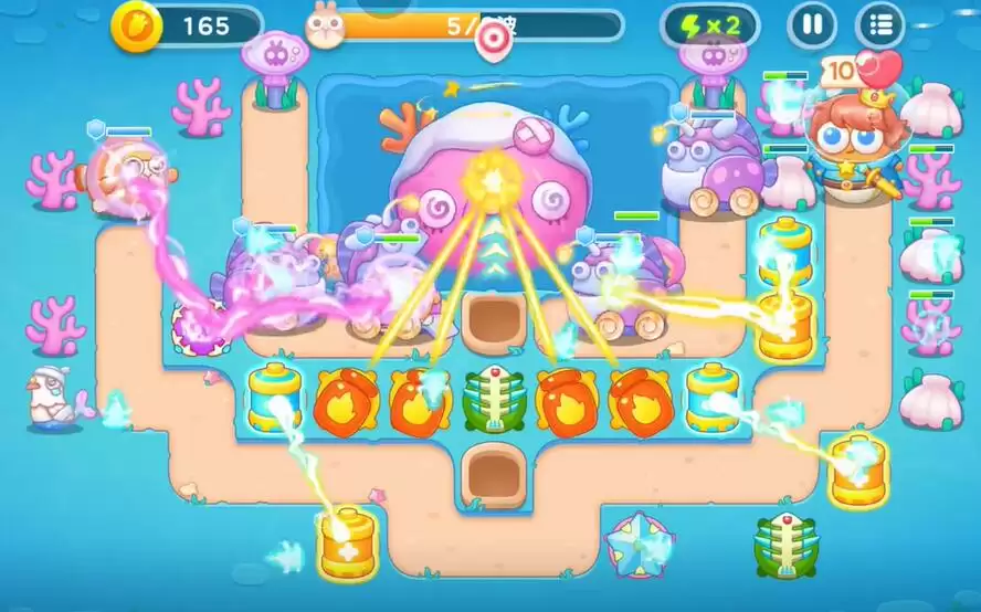 5、在中央建造一个鱼骨,右下角建造一个减速塔对兔子小怪进行攻击。
