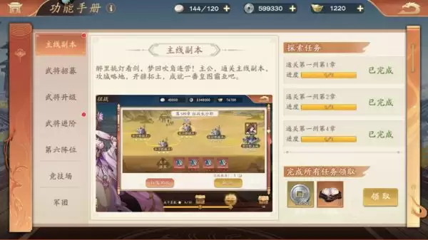 6、点击手册图标,完成手册中的副本任务也会有元宝、体力以及银币奖励