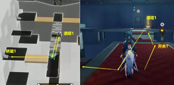 (3)从【桥梁2】上来后,打开【开关2】去【酒塔1】获得次数后,从【桥梁3】上去。