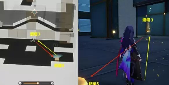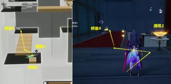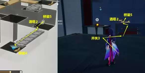 (5)从【桥梁4】上来后,打开【开关3】去【酒塔2】获得次数后,从【桥梁5】上去。