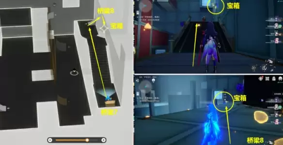(11)从【桥梁7】上来后,再从【桥梁8】上去,上面就是宝箱位置,开了宝箱,解密完成。