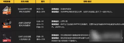 ump9的人形的属性来说伤害和命中都不高,但她的射速和回避都很高,这使得她可以在战斗中快速地输出伤害,同时也可以有效地躲避敌人的攻击。ump9的暴击率和护甲都很低,这意味着她不适合与高伤害或高穿透的敌人对抗,需要注意保护自己的生命。技能方面,第一个是主动技能烟雾弹,开场后6秒,每隔16秒,向前方扔出一个烟雾弹,持续5秒,烟雾弹覆盖范围内的敌人命中和移动速度下降40%,同时我方全体回避提升22%。人形特殊装备:UMP UX外骨骼,提供回避+35,暴伤+25%的属性加成。