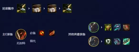 肉装优先给赵信,攻速装前期给巴德,后期转给厄加特,法强装给龙王。