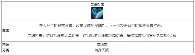 积攒到12个灵魂后,会在下次攻击命中目标时会发动灵魂打击,对目标造成60点伤害,并对半径为2格范围内的所有敌人造成1⁄4的溅射伤害。每次发动后,灵魂打击伤害永久增加0.5%。