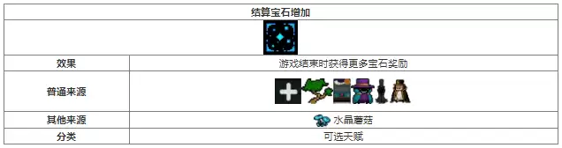 持有该天赋时,游戏结束时玩家通过金币和击败敌人数量转化的宝石收入将增加25%。