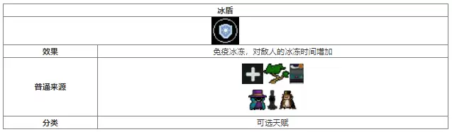 使玩家受到的 冰元素伤害降低1到2点,例如: 雪人王、 雪猿投手的小型雪球、雪人王和 雪山大猿王的冰刺。