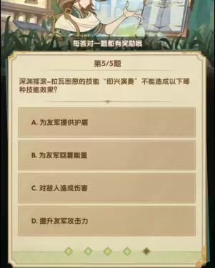 5、深渊摇滚-拉瓦图恩的技彪“即兴演奏”不造成以下哪种技能效果?【提供护盾】