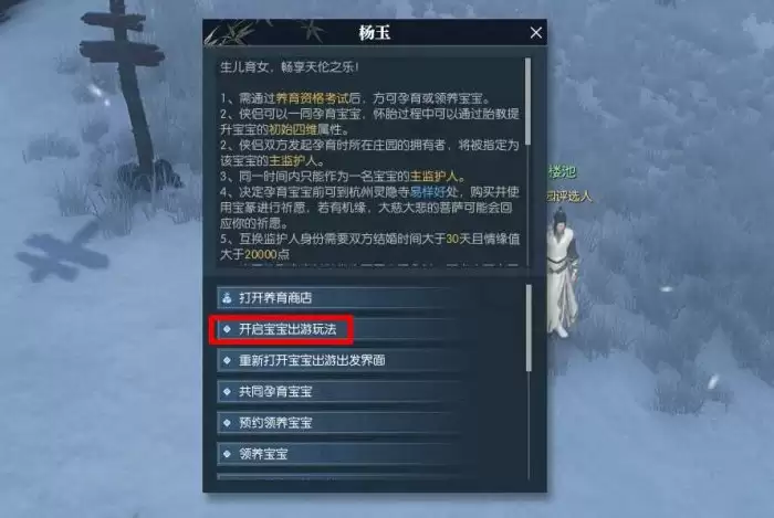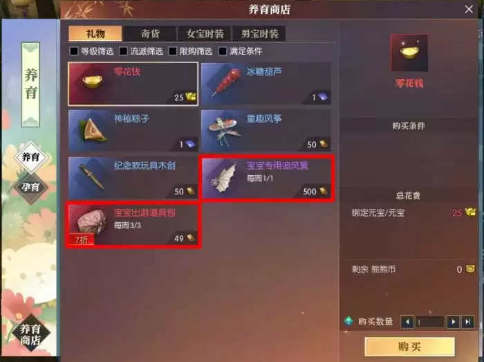 ③出游时可在养育商店中花费49点游历点兑换宝宝出游道具包,打开后可随机获得出游道具。