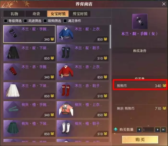 熊熊币可通过养育商店中兑换宝宝的时装来装扮宝宝,也可兑换手推车、称号的奖励。
