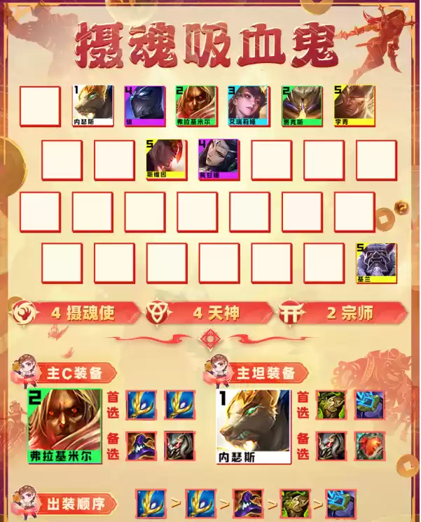 2.阵容羁绊:4摄魂使4天神2宗师2秘术2决斗2玉剑1忍者