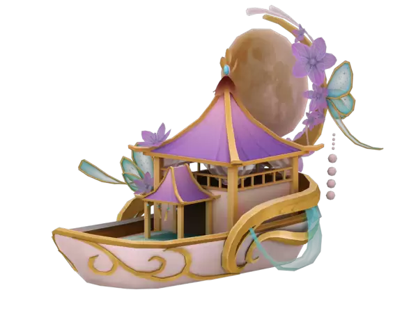 3级的繁花夜明和前两款区别较大,船体由红色和深褐色组成。橙红色的丝带,紫色的扇子,还有很多花朵做点缀,船体周边还漂浮着几个可爱的灯笼,在黑夜还能起到照明的作用。奢华、大气、有档次说的就是繁花夜明了。