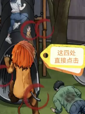 3、接着再找出危险的地方,分别是塌方的危险、光滑的滑滑梯、狮子屁股上的钢管、锋利的爪子;