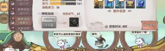 当三只猫猫总力量、智慧、灵巧越满足探险数额要求,获得探险经验和基础资源比例越高。
