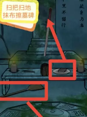 7、来到洞穴中使用抹布擦拭墓碑,拖把扫干净地面,接着扶正香炉,将旁边的香插进香炉中并用蜡烛点燃;