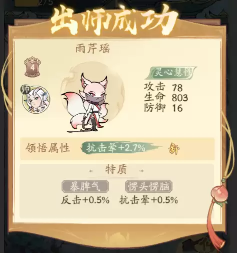 完成修炼出师,弟子还会领悟新属性,为道友提供更多属性加成。