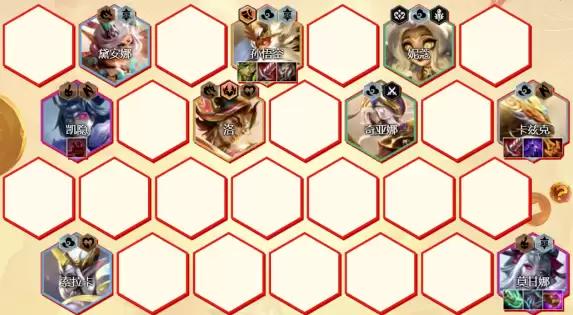 1、阵容组成:螳螂、妮蔻、戴安娜、奇亚娜、索拉卡、凯隐、莫甘娜、洛、孙悟空