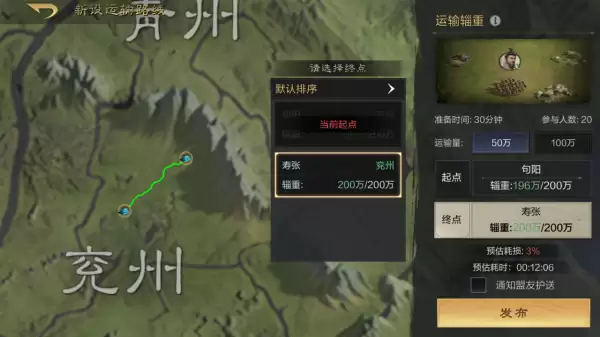 在同盟界面,选择下方的辎重,新设定一个运输路线。我们以同一个州的“寿张”和“句阳”为例子,起点为“寿张”,终点为“句阳”,点击发布后,就会给30分钟准备时间,在这期间同盟成员可以选择护送辎重队伍。