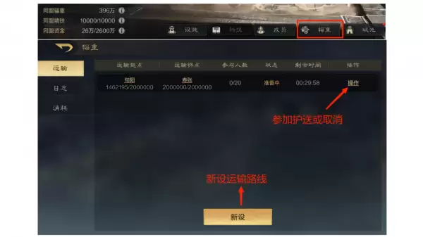 在辎重运输前的30分钟准备时间里,同盟内所有人可以在辎重页面看到准备中的辎重运输路线。同盟成员可以派遣部队护送运输部队,一条路线只能有一个人参加,*多可参与20个人,护送部队会跟随运输部队到达目的地。