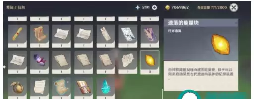 遗落的能量块共有20个,用于激活须弥地区的5个遗迹守卫。玩家需要消耗15个能量块来完成所有守卫的激活。