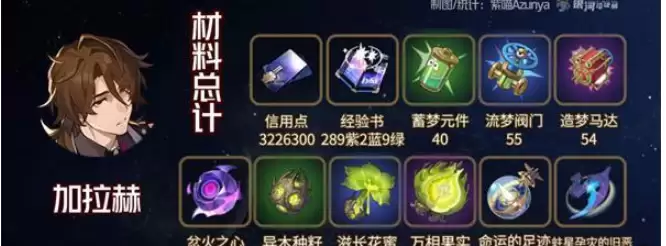 1.崩坏星穹铁道加拉赫突破材料需要:信用点*3226300、经验书289紫2蓝9绿、蓄梦元件*40、流梦阀门*55、造梦马达*54、忿火之心*50、异木种籽*12、滋长花蜜*54、万相果实*105、命运的足迹*5、蛀星孕灾的旧恶*12。
