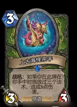 上古海怪杀手(Ancient Krakenbane)是潮汐王座加入的一张3费的稀有品质的猎人随从牌,如果这张卡在我们手牌中的时候我们释放过三个法术,这张卡出场的时候就可以造成五点伤害。