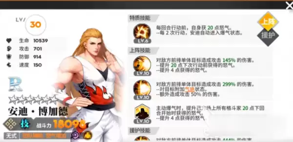 2、阵容搭配:这一关的拉尔夫在受到攻击后是必定触发格挡技能的,这一关是没有摔投特性角色的。不过敌人如果是在“眩晕”状态,那么也是无法触发格挡的,因此这一关需要用到的角色是特瑞,然后在加入一个安迪即可,安迪在这里的作用是提升特瑞眩晕的几率。