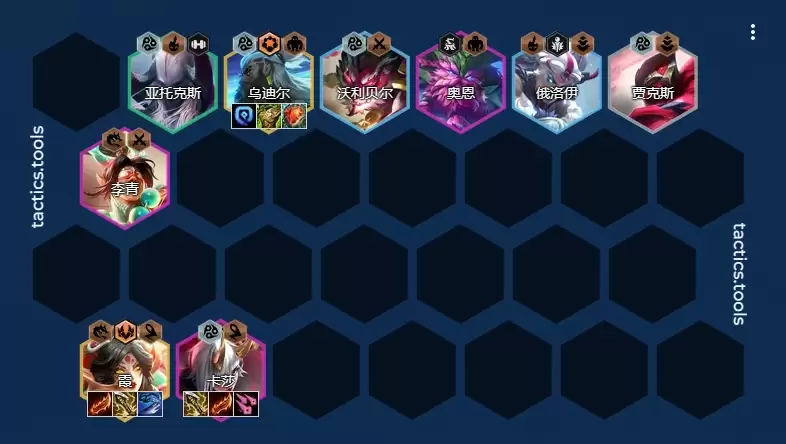 8人口,8人口还是大D阵容成型,乌迪尔没有来之前用赛娜开5墨之影,下没有用任意迅捷开二迅捷,前排看狗熊和奥恩谁二星谁带肉装,二星卡莎搭配二星前排即可考虑升9了。