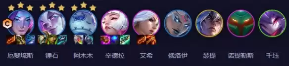 本阵容精选了厄斐琉斯、锤石、阿木木、辛德拉、艾希、俄洛伊、瑟提、诺提勒斯以及千珏等英雄,他们相互协作,形成了一个多维度、多功能的强大战队。
