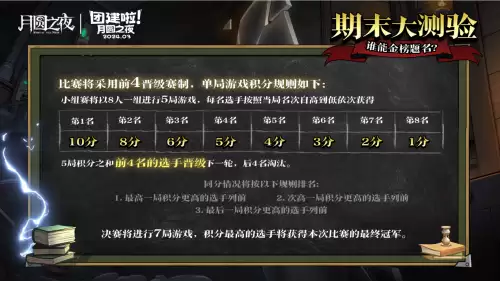 3月30日,《月圆之夜》S2赛季最后一次团建活动开启,所有玩家届时可以一同前往各大直播间观看比赛,支持你喜欢的主播,看看谁是三好学生,夺得期末大考头名,为自家平台赢得荣耀!