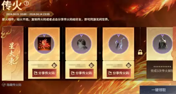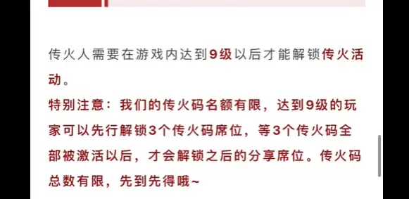 1、每个账号只能拿到三个传火码,如果有人分享了很多的传火码那就是假冒的。