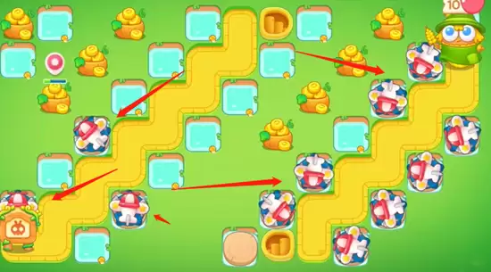 2、利用飞机的全屏伤害,把出口这边的道具打掉之后我们在出口这一次也放置飞机,然后把剩余的钱袋子打掉。