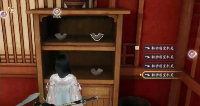 答:按照提示摆放左边禅院柜子里的碗。