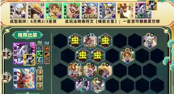 金铲铲之战s11天将虫子应该怎么玩呢?这个玩法需要精致古董以及天将的转职文章才行,要求还是比较高的,缺一不可不然伤害会很低,如果两个都有那么基本上就是稳定吃分的,下面一起来看看吧!