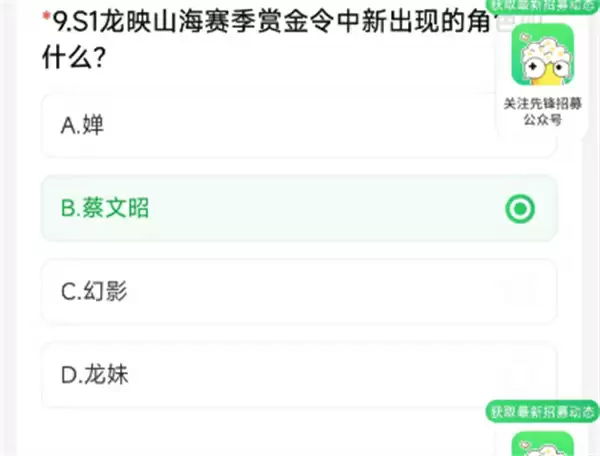 S1龙映山海赛季赏金令中新出现的角叫什么?这个可能很多的小伙伴都没有注意到的这个,这个是4月的体验服的问题,可能有些小伙伴不知道这个答案是什么,下面感兴趣的小伙伴可以和小编一起来看看吧!