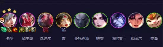 2、加里奥如果1星别单顶,2星有狂徒板甲就单顶;希维尔和红卷轴天使把卡莎包起来。