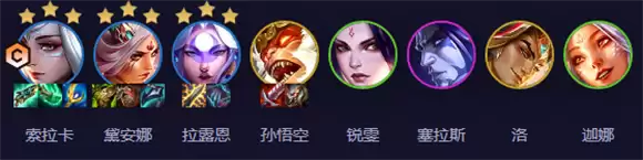 索拉卡、黛安娜、拉露恩、孙悟空、锐雯、塞拉斯、洛、迦娜